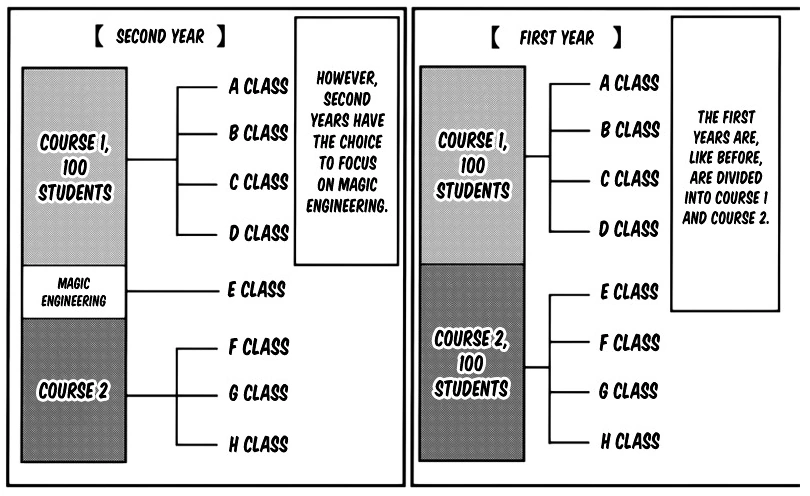 The new Year 2 Students have the option to choose between the original Magic Study or Magic Engineering Classes. Students who choose to continue with original Magic Study will still be divided into 4 classes of Course 1 Students and 3 Classes of Course 2 Students. On the other hand, students who choose Magic Engineering Course will have to pass an examination in March before joining the newly established class.