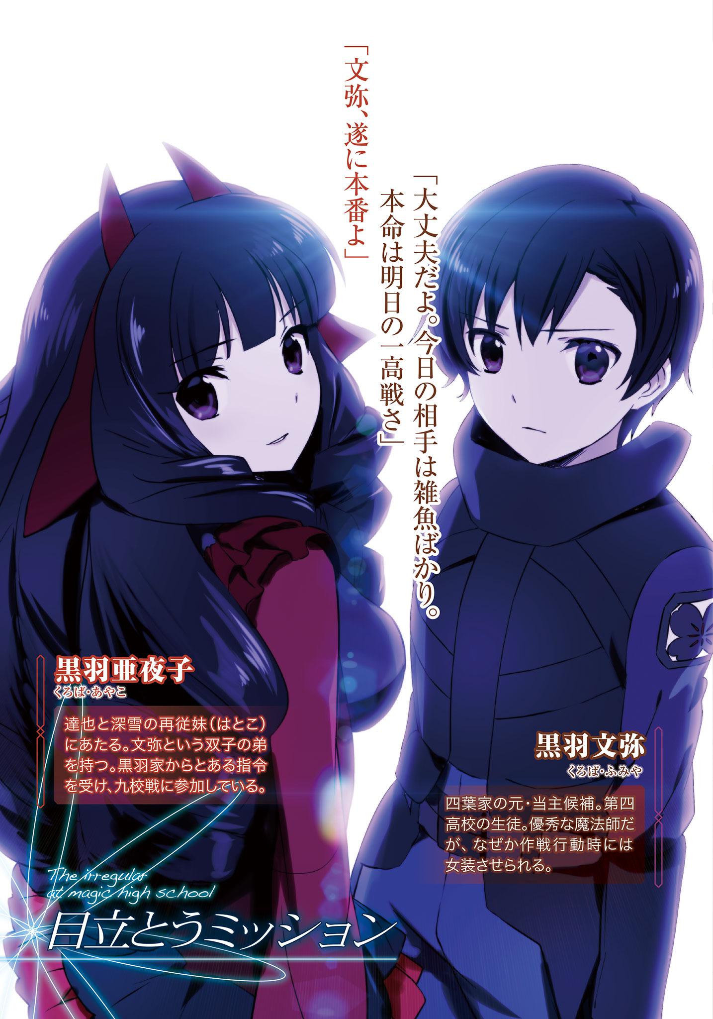 Fumiya and Ayako were given new orders from Maya. They were told to introduce themselves to Tatsuya at the Nine School's Competition. While this wasn't considered difficult or hard to understand, but they would need to create a situation that looked natural to bystanders. While Fumiya was thinking about it, Ayako says that she will take care of it. Seeing Ayako's confident attitude, he didn't question her response. Fumiya knows that while on the outside Ayako acts like a carefree girl, she is quite serious, intelligent and responsible. Fumiya changes the subject and asks Ayako about Mirage Bat and whether or not her magic will be completed. Ayako had a troubled look on her face and said that it hasn't been completed yet. Ayako asks about Fumiya's magic and whether or not he has found a magic that will work with Direct Pain, to which he responds yes. The two of them continue to talk about what they should bring tomorrow to the Nine School's Competition. ◇ ◇ ◇ The day before the Nine School's Competition, the students from Fourth High were gathering at the hotel. Among the group of the students, Ayako was quite conspicuous, which cannot be helped. Magicians tend to have better looks than most people but Ayako's appearance is drawing the attention of everyone that passes by. Students from other schools are also looking for opportunity to speak with her. Ayako is not looking to stand out any more than she already is and starts to walk towards Harumi. Harumi was surprised to see Ayako approach him and asks if he can help her with anything. Ayako apologizes and with a smile says that she found out that he has relatives in First High. Harumi says that his cousin goes to First High. Harumi is starting to get looks from both the boys and girls. He isn't very popular, he is a promising magician and is related to a very wealthy family. However, his character and personality tended to make girls shy away from him. Most of the girls were wondering why Ayako is interacting with him. Ayako mentions that there is someone from First High that she would like to meet. When Harumi asked she said that it was Shiba Tatsuya. Harumi knew of Tatsuya, especially after the his performance last year with his engineering skills. Harumi asked if Ayako was a fan of Tatsuya's and he didn't ask her in a way that made it seem like he was jealous, he naturally thought that it is inevitable for some people to admire Tatsuya. Ayako says that she isn't a fan of Tatsuya but that Fumiya is. Harumi says that he will go speak with Shizuku, and as he walked over towards her, he noticed that Tatsuya was talking to the "Prince" and "Cardinal". Harumi greets Shizuku and tells her that his juniors would like to meet Shiba Tatsuya. He looks back towards Ayako and Fumiya as they slowly bow towards her. Shizuku is a little confused and confirms that they want to meet Tatsuya and not Miyuki. Harumi says that Fourth High is known for their magic engineering after all. Shizuku heads over to Miyuki, and they quickly bring Tatsuya over. Harumi introduces himself and apologizes for interrupting his conversation but Tatsuya says that he was already wrapping up the conversation with Masaki. When Tatsuya said this Harumi felt the tension relax and his opinion of Tatsuya had changed quickly. He could see why the Kuroba siblings would be interested in him. Harumi leads them over to Ayako and Miyuki. (Where they have the same conversation as in the light novel) ◇ ◇ ◇ Later that night, Fumiya and Ayako met up with each other at the hotel's garden outside. They were each wearing dark clothes, and after greeting each other they started walking. Ayako activated Perfect Diffusion and their figures blended into the darkness of the night. The orders that were given to Fumiya and Ayako from Maya was to "stand out" at the Nine School's Competition, and to make contact with Tatsuya. They didn't have orders to investigate the parasite situation while at the Nine School's Competition, but since they had been involved with this mission since the beginning, they had no intention of stopping just because of their school event. They were here to survey the site of the Steeplechase event, where the parasite test was to be conducted. They don't know exactly how many parasites will be participating in this test or if there are plans to stop the test, but they guess that this will be left to Tatsuya. As they were about to enter the Steeplechase area, they came to a stop. Fumiya asks Ayako what she thinks and she says that the placement of the active sensors is too dense and there is no way for her to get through. Ayako's Perfect Diffusion is a magic that diffuses and levels electromagnetic waves, sound waves, and air currents. Because of its characteristics, Ayako is sensitive to the bias of electromagnetic waves and sound waves emitted in the air. There is no sensitivity to perceive up to the fluctuation of the light waves before fruition as faint visible light, but already existing distribution can be felt in a very wide range. The Steeplechase course is a four kilometer square but this is still within her detection range. (However, immovable solids can not be perceived) Ayako says that if it was only the passive sensors that she wouldn't have an issue. Passive sensors only sense electromagnetic waves and sound waves emitted by intruders. The active sensors however would recognize that the leveling out of infrared rays and ultrasonic waves as abnormal. While they discuss the possibilities of forcing there way onto the course, they decide against it. Just then someone called out their names from the darkness. Ayako panicked as Fumiya greeted Tatsuya as he approached, and she was very upset that Tatsuya scared her. They discuss the course and the security, Tatsuya asks if Ayako could break through but she lowers her head slightly ashamed of herself. Fumiya changes the subject and asks if they should try together to go view the course, but Yakumo shows up n