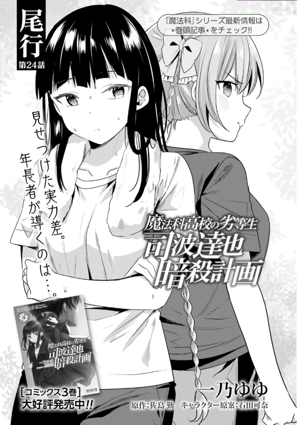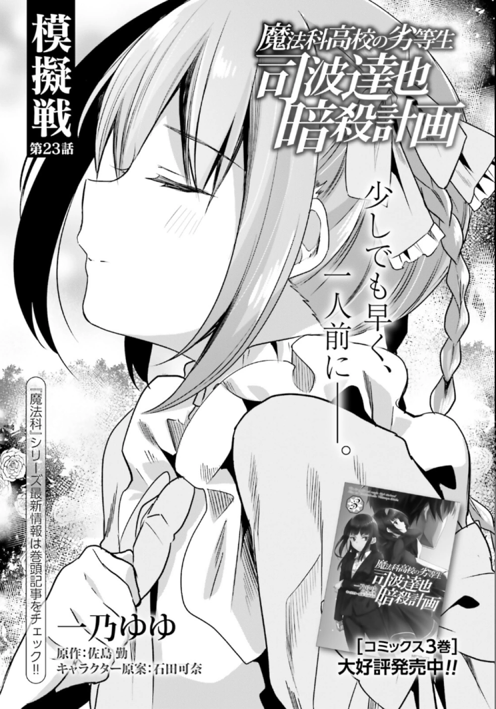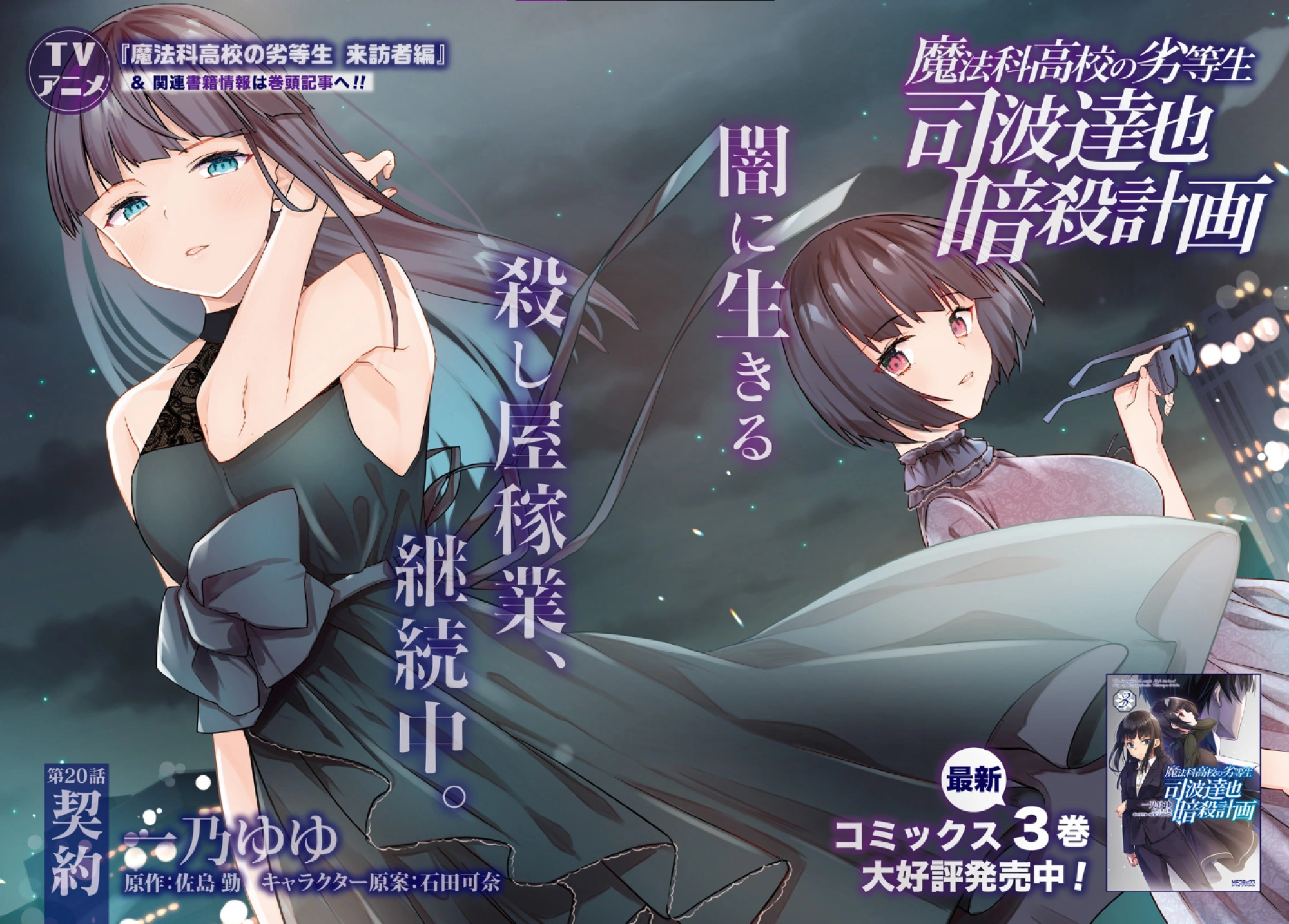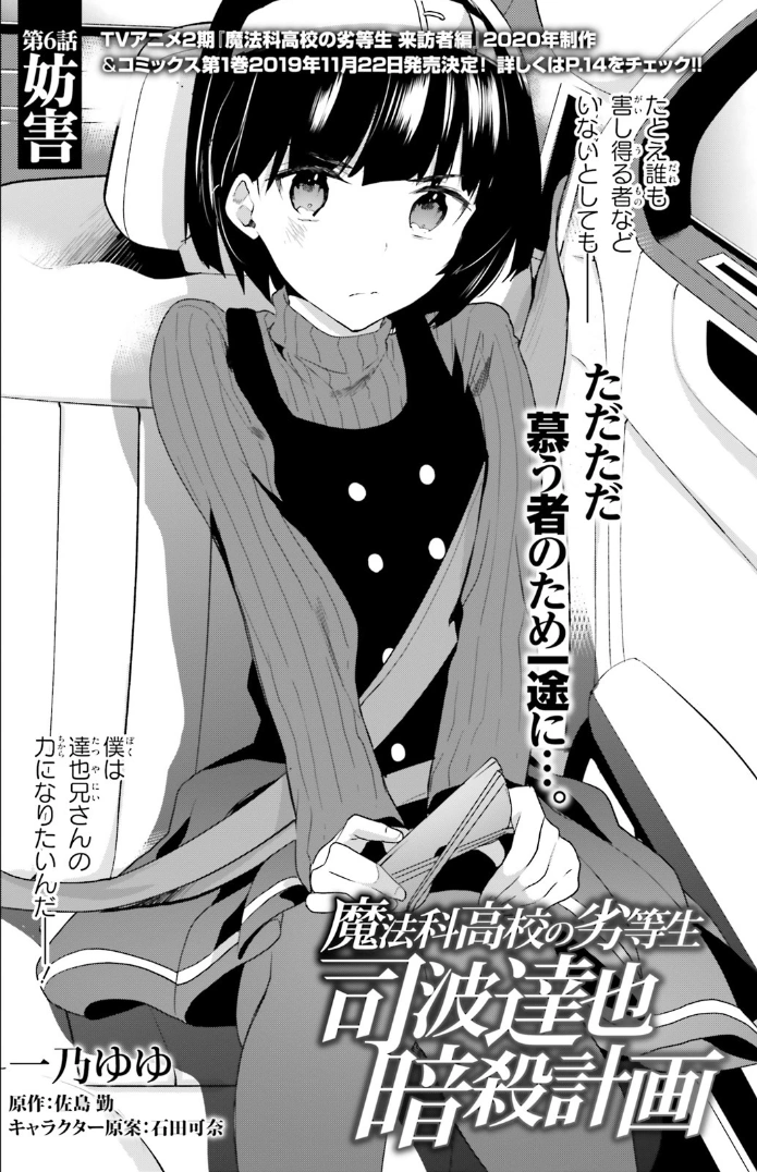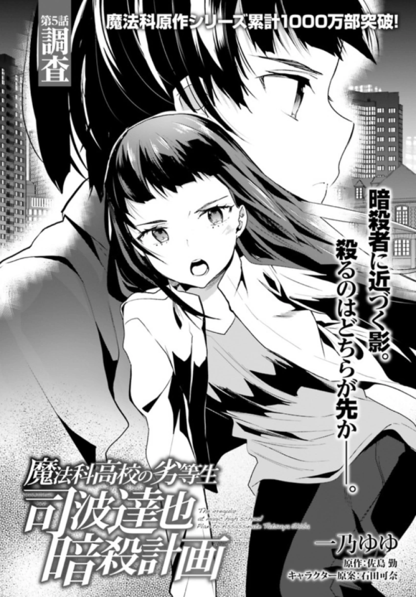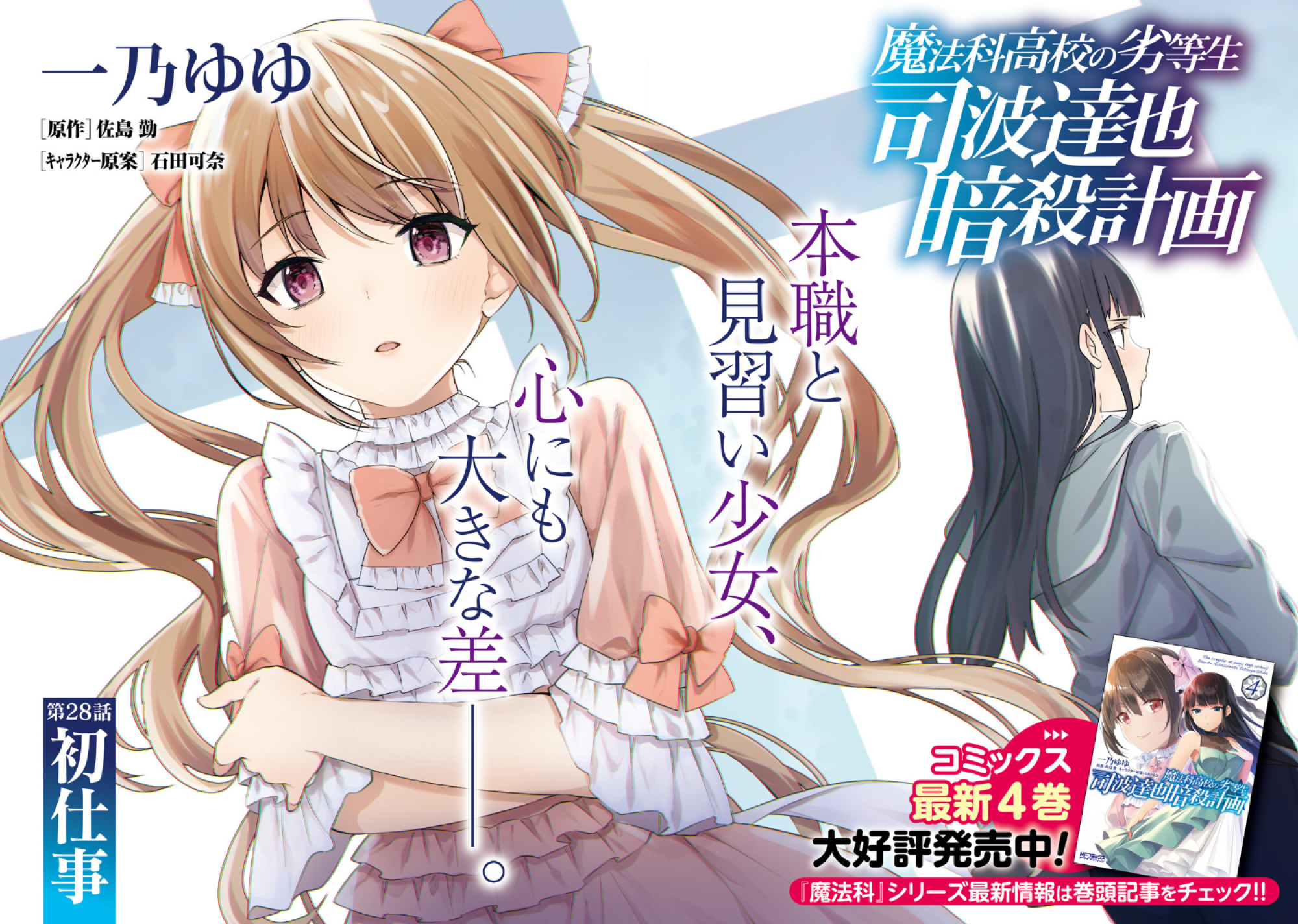 Shiba Tatsuya Ansatsu Keikaku (司波達也暗殺計画) is a manga based on the spin off series Plan to Assassinate Tatsuya Shiba which follows the story of Hashibami Yuki, a professional assassin. The adaptation is by Ichino Yuyu (一いち乃のゆゆ), character designs by Ishida Kana. It began publication on May 27th, 2019 and is serialized by Monthly Comic Alive.