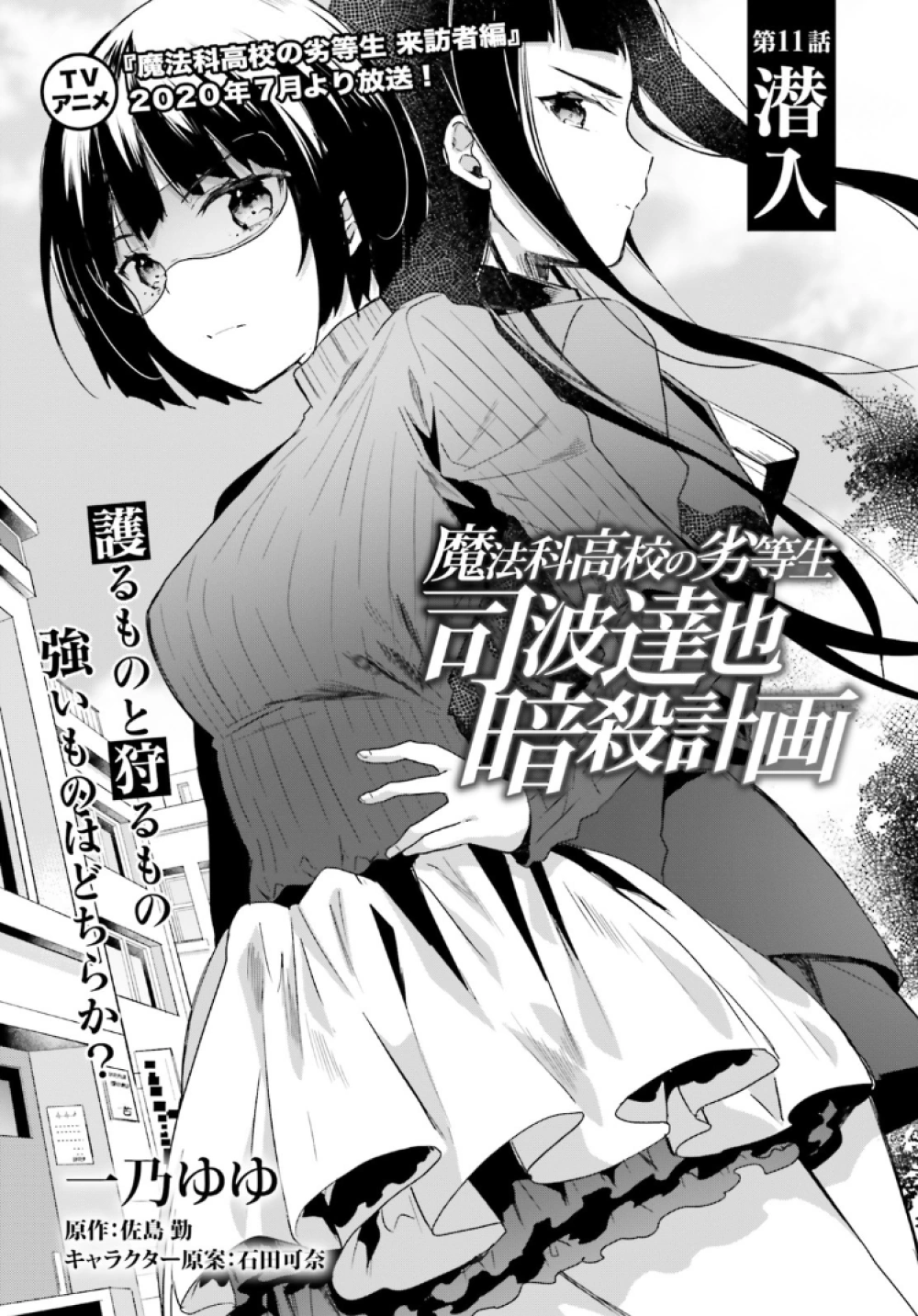 Two days later Yuki is very embarrassed to be dressed in a middle school uniform and trying to infiltrate Tatsuya’s school for reconnaissance. When she notices the other students making a fuss, she turns to see the Shiba siblings and is shocked by Miyuki and her appearance. The Shiba’s casually walk to school together alone. She tried to take measure of Tatsuya's abilities but can't read him at all, with makes her anxious. Tatsuya look's back and, after hesitating a moment to think, she decides against the plan and flees the scene.