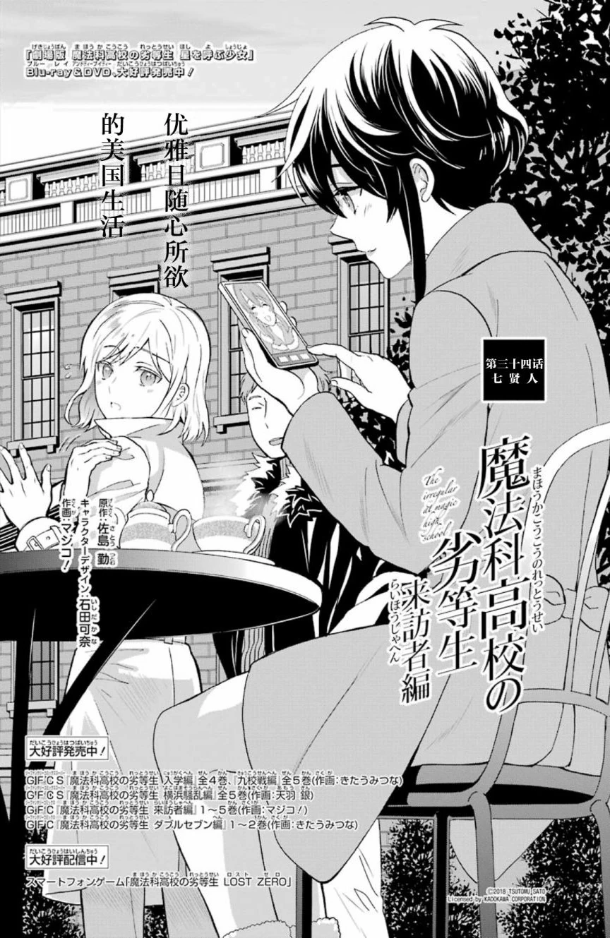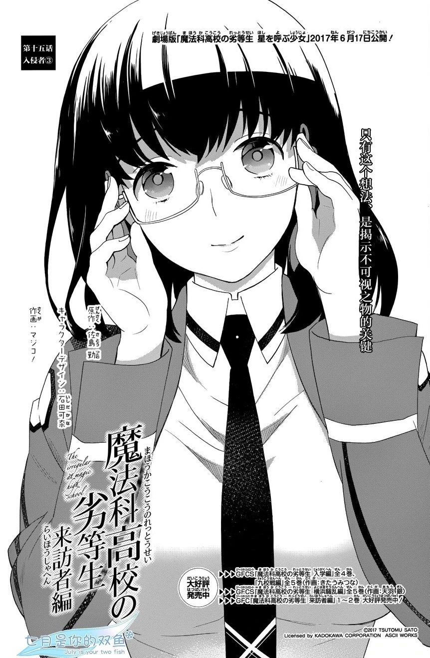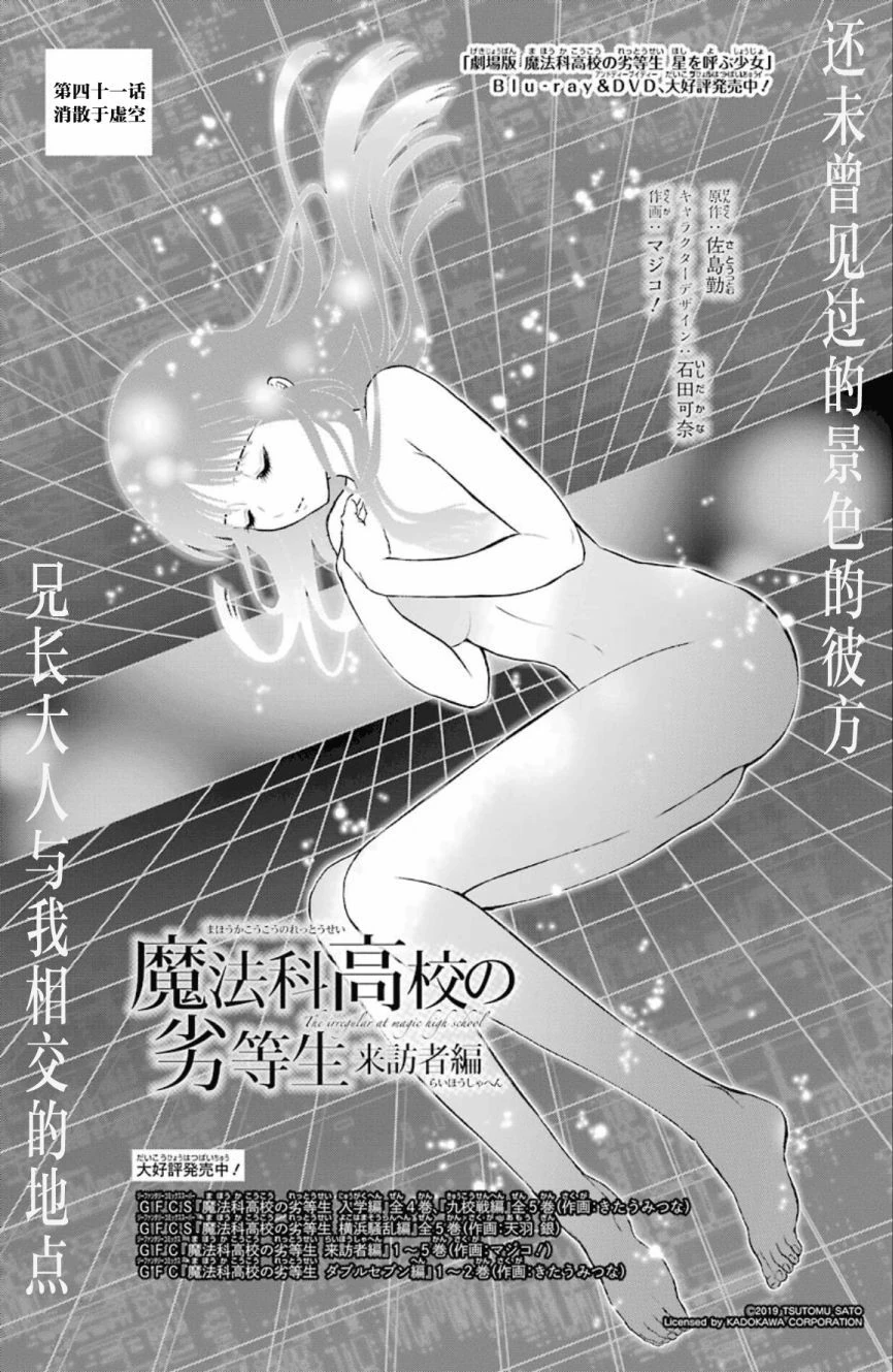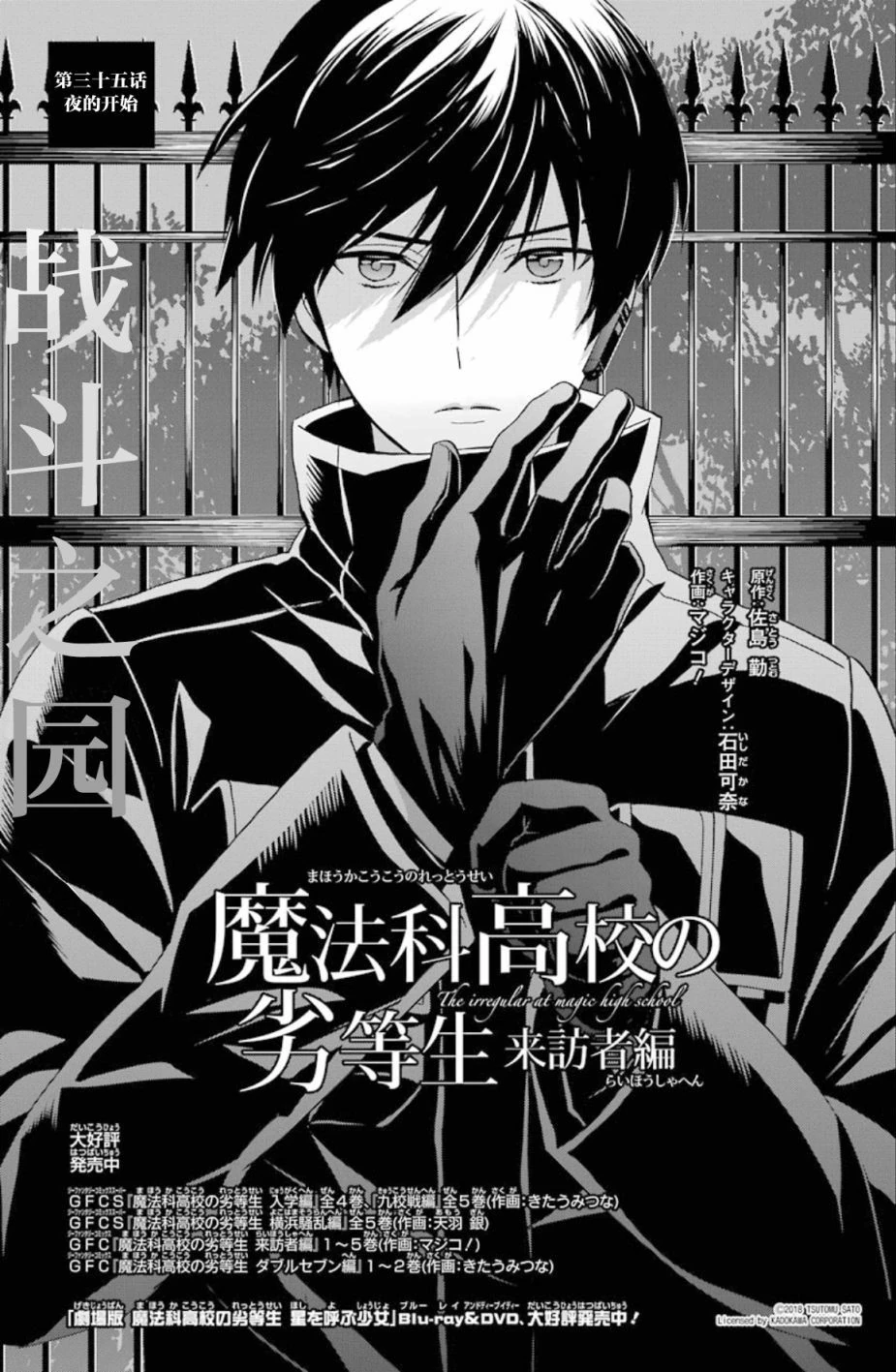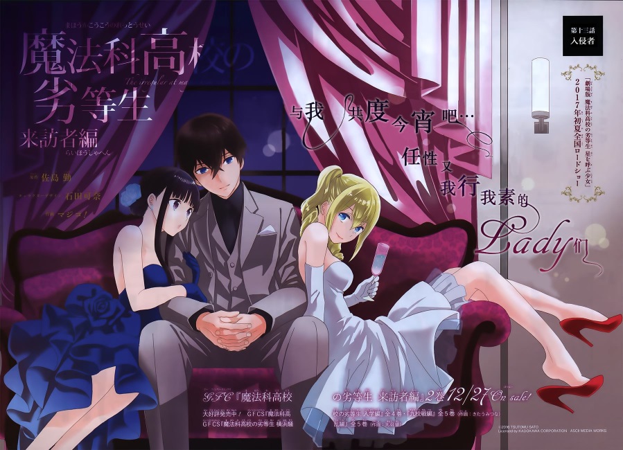 Mahouka Koukou no Rettousei Raihousha-hen (魔法科高校の劣等生 来訪者編) is the manga adaption of the 'Visitor Arc' from the 9th, 10th and 11th volumes of the light novel. The adaptation is by Magico! (マジコ!). It was serialised for 43 chapters in GFantasy Magazine, running from November 2015 until June 2019. An extra chapter, featuring a four page epilogue for the arc, was later released and included in Volume 7 of the manga.