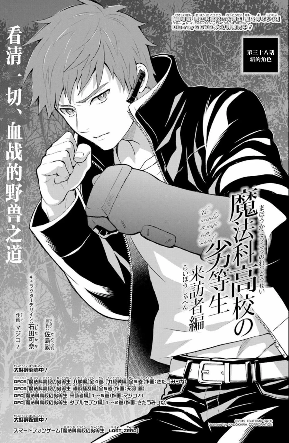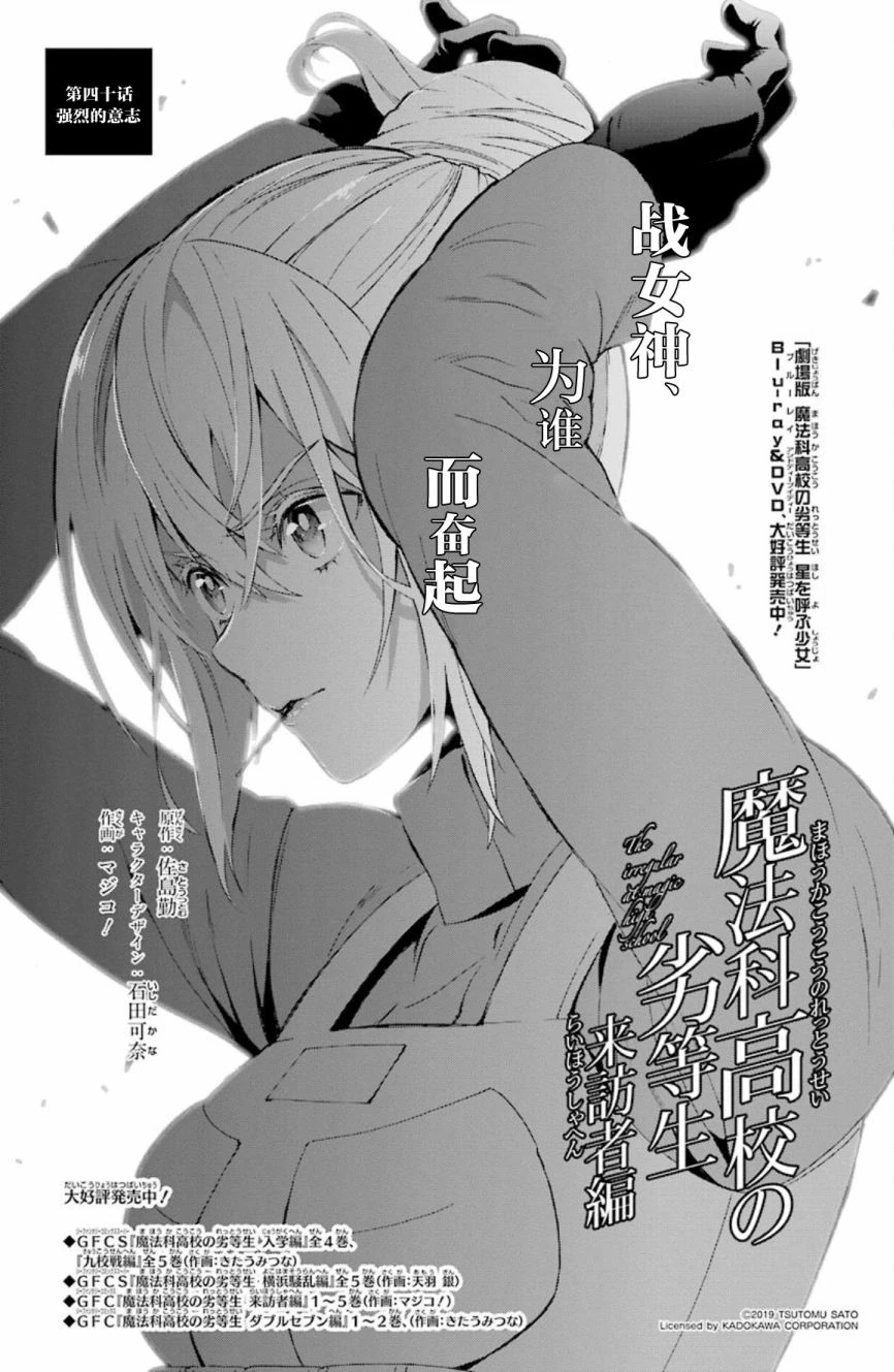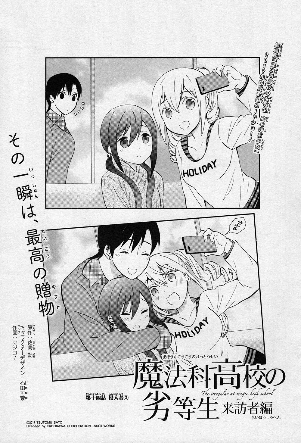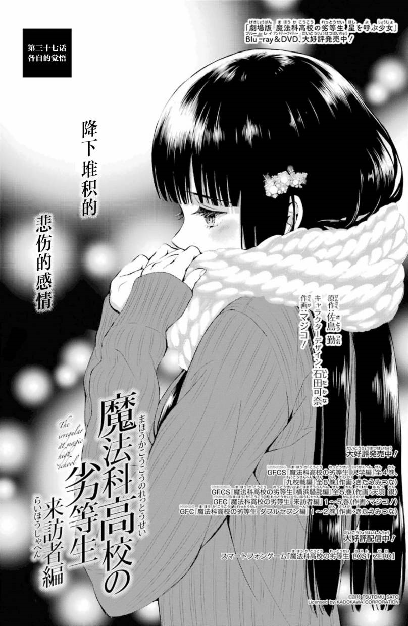 Mahouka Koukou no Rettousei Raihousha-hen (魔法科高校の劣等生 来訪者編) is the manga adaption of the 'Visitor Arc' from the 9th, 10th and 11th volumes of the light novel. The adaptation is by Magico! (マジコ!). It was serialised for 43 chapters in GFantasy Magazine, running from November 2015 until June 2019. An extra chapter, featuring a four page epilogue for the arc, was later released and included in Volume 7 of the manga.