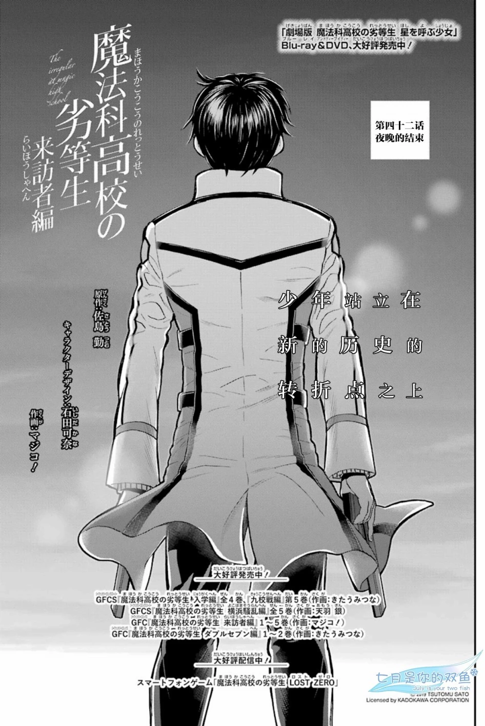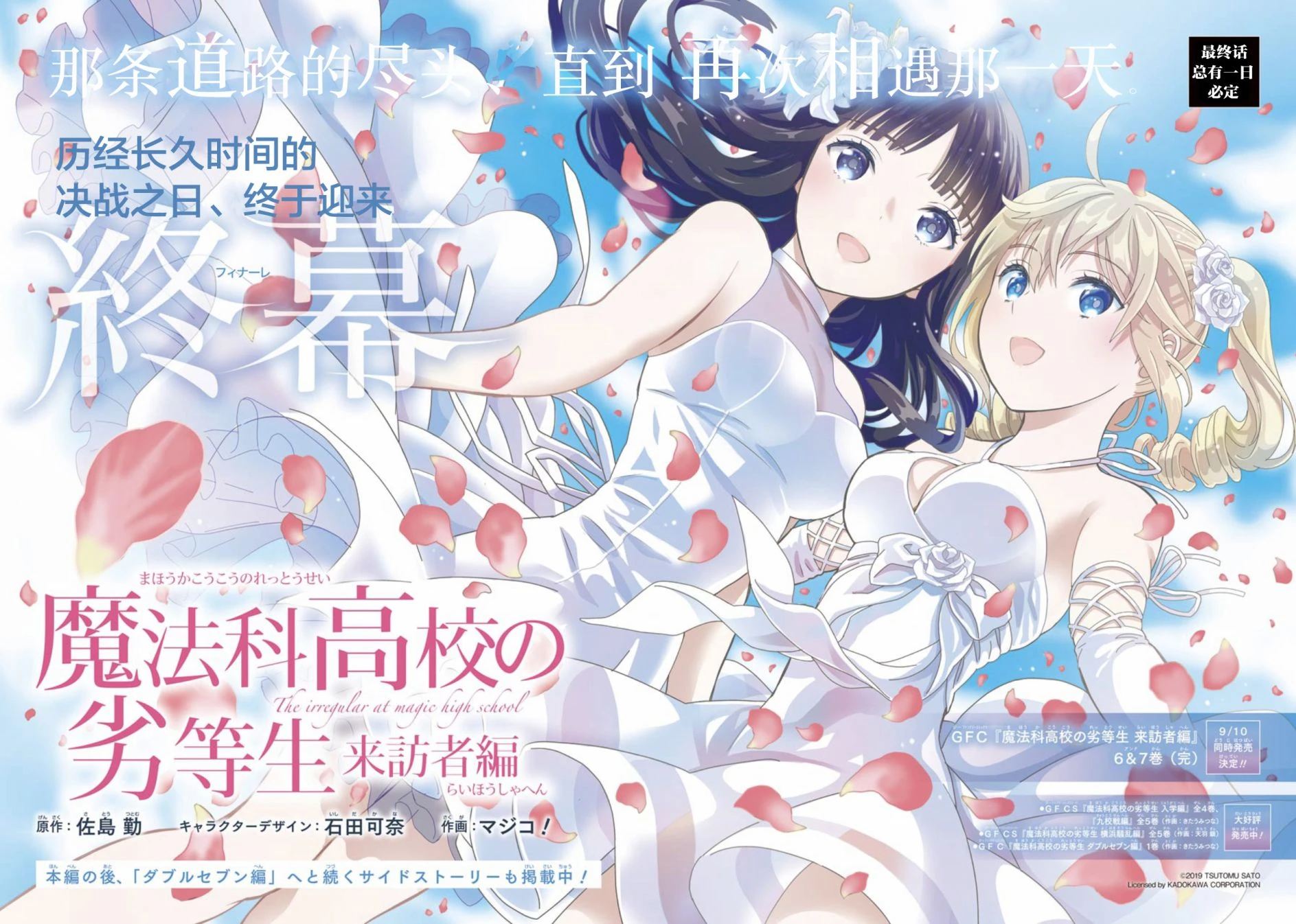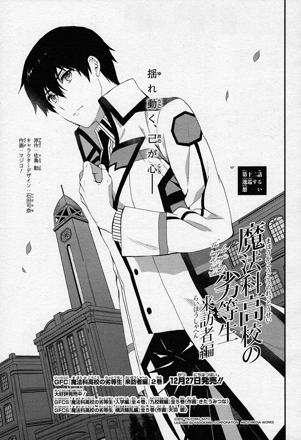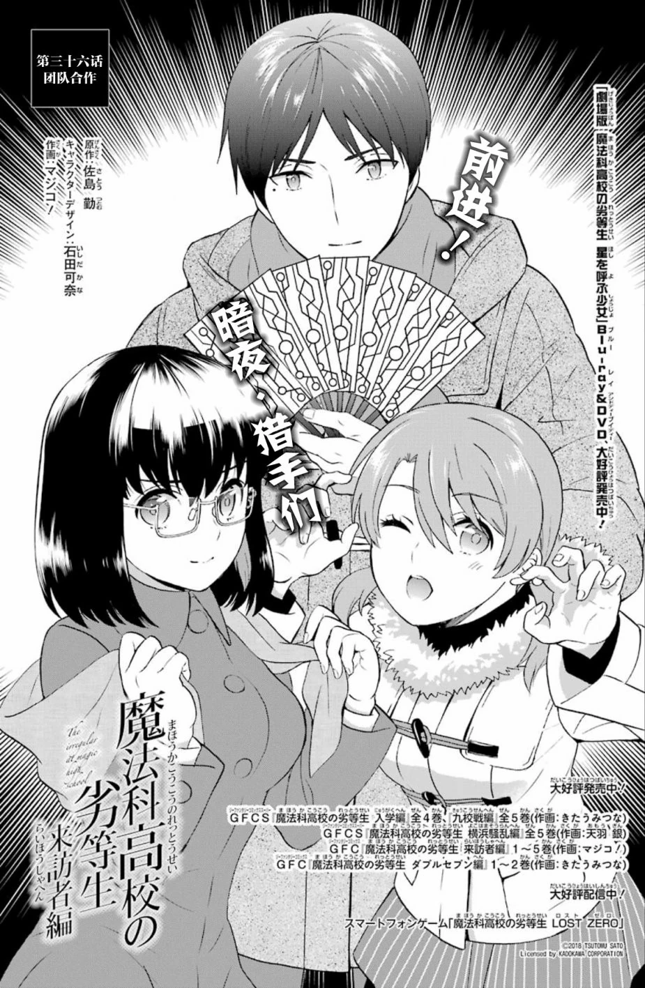 Mahouka Koukou no Rettousei Raihousha-hen (魔法科高校の劣等生 来訪者編) is the manga adaption of the 'Visitor Arc' from the 9th, 10th and 11th volumes of the light novel. The adaptation is by Magico! (マジコ!). It was serialised for 43 chapters in GFantasy Magazine, running from November 2015 until June 2019. An extra chapter, featuring a four page epilogue for the arc, was later released and included in Volume 7 of the manga.