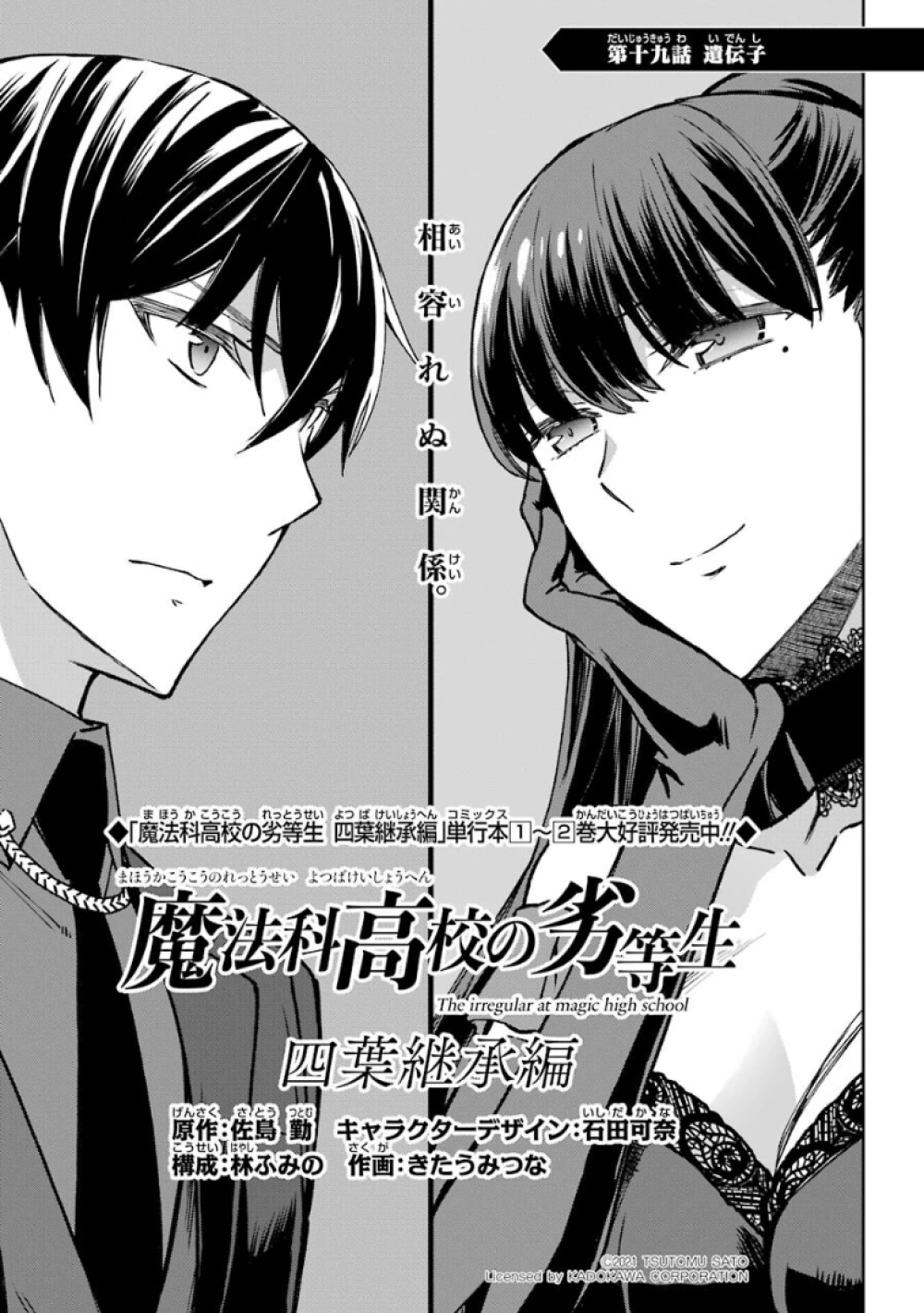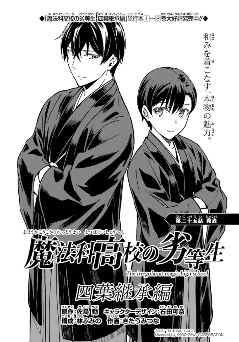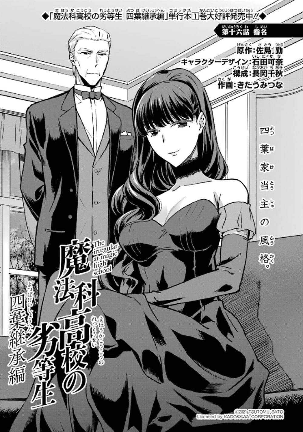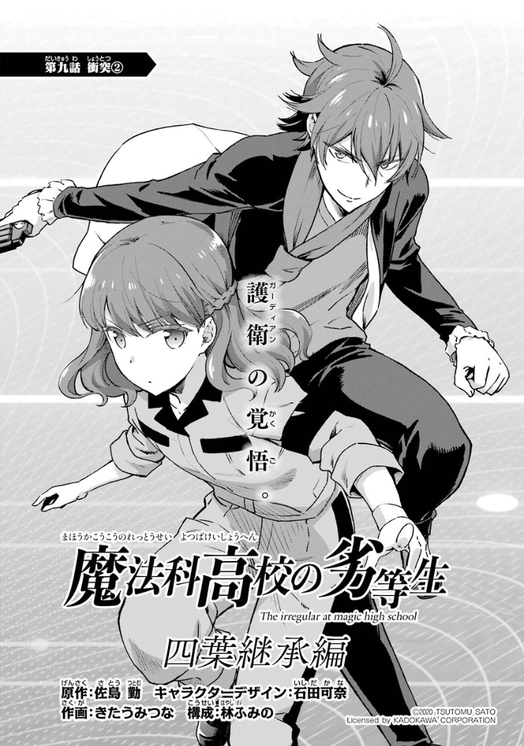 Mahouka Koukou no Rettousei Yotsuba Keishou-hen (魔法科高校の劣等生 四葉継承編) is the manga adaption of the of the Yotsuba Succession Arc' from the 16th light novel. The adaptation is by Kitaumi Tsuna (きたうみつな). It began serialising in GFantasy Magazine in December, 2019, running for twenty-six chapters until it completed in March, 2022.