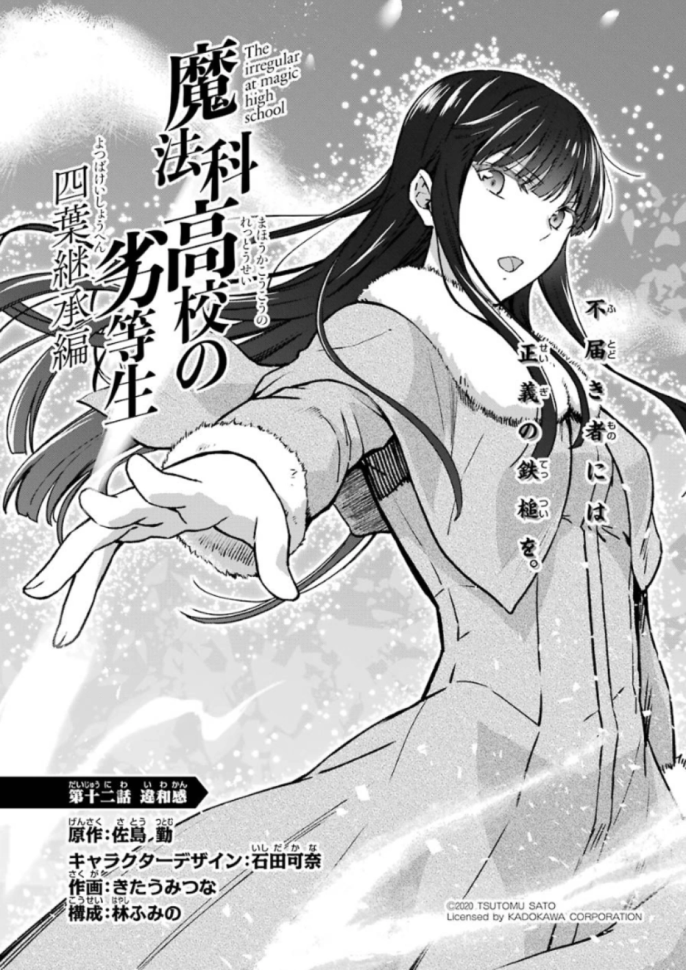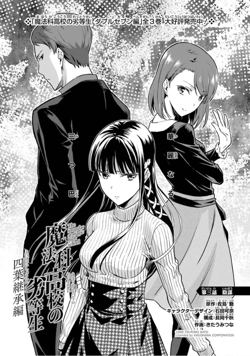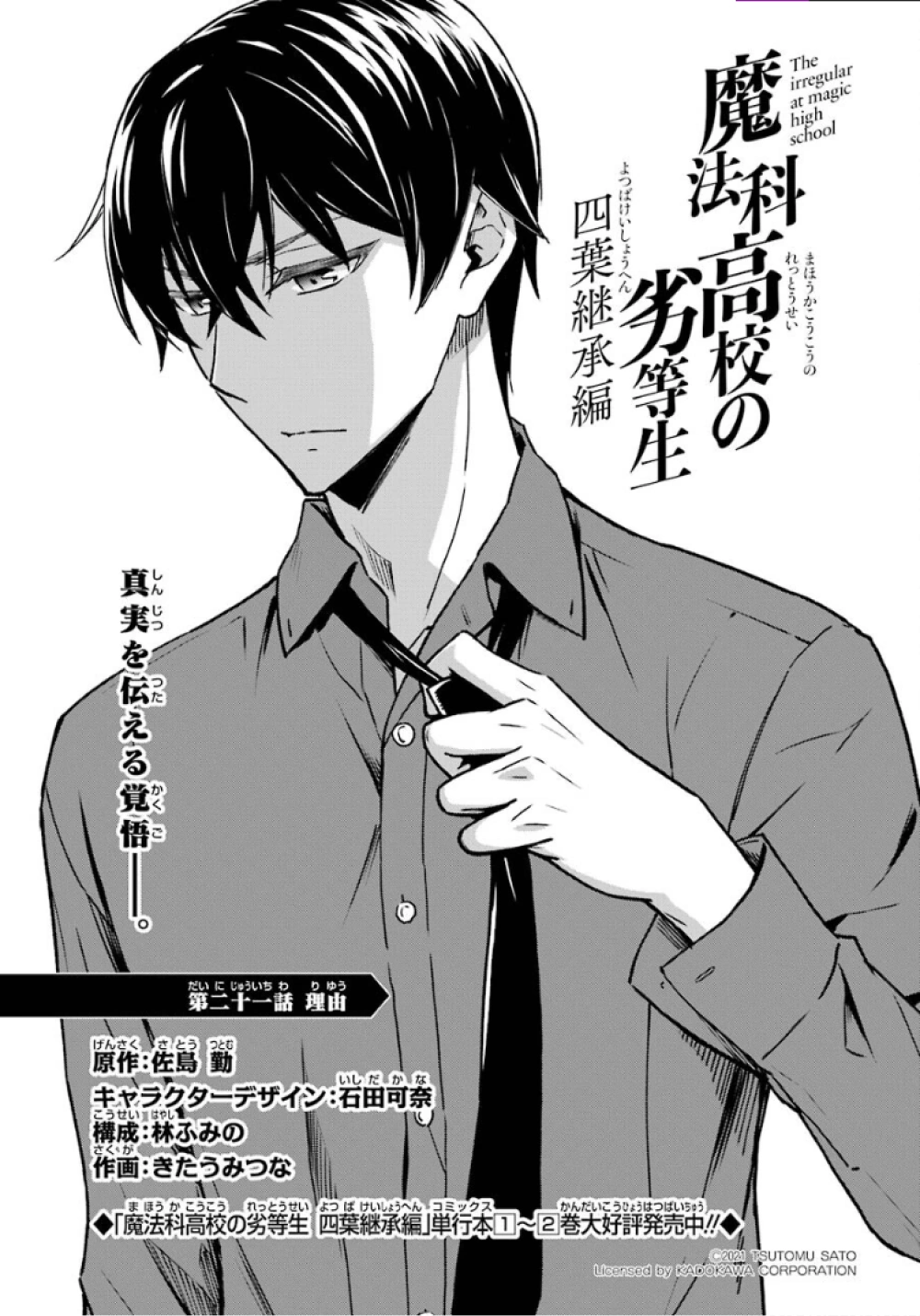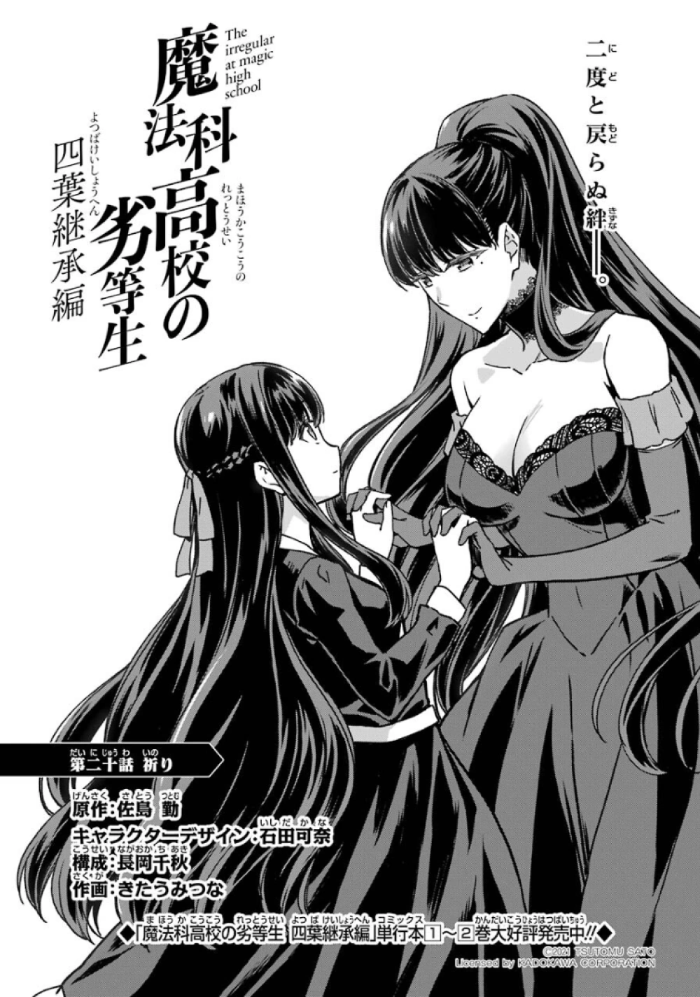 Mahouka Koukou no Rettousei Yotsuba Keishou-hen (魔法科高校の劣等生 四葉継承編) is the manga adaption of the of the Yotsuba Succession Arc' from the 16th light novel. The adaptation is by Kitaumi Tsuna (きたうみつな). It began serialising in GFantasy Magazine in December, 2019, running for twenty-six chapters until it completed in March, 2022.