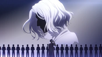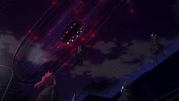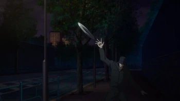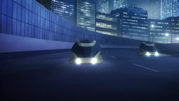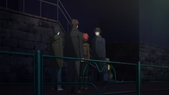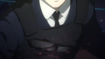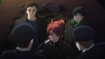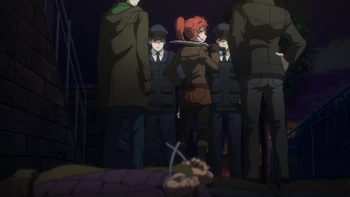 Back by Aoyama Cemetery, Erika, Leo and Mikihiko discuss how to move the parasites when two police officers arrive and demand to know what is happening. Mikihiko gets flustered but Erika becomes confrontational, making it clear she knows they are fakes and calls them out. Their ruse having failed, one of the officers hidden allies then attacks Mikihiko from behind, but is stopped by Leo, though the attacker’s body armour blocks Leo’s counterattack. Another two target Mikihiko before he can aid Leo, forcing him to defend and dodge a net. Mikihiko dodges into the air and dodges a second attack before incapacitating both attackers in moments. From atop the wall, Mikihiko surveys the situation and sees Erika and Leo locked in fierce melees with the remaining three attackers and realises they are being drawn away from the parasites. Suddenly a gas bomb is dropped and Mikihiko issues a warning as it explodes. Mikihiko clears the gas to see a crane lifting the parasites into a concealed airship. Erika is about to attack but Mikihiko stops her as it would cause a disaster if the ship were brought down in the city, meaning they can only watch as it leaves with Marte and his companions.