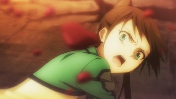 4:03pm. The evacuees reach the entrance of the underground shelter, seeing the coast is clear, Azusa runs towards the entrance, but a silhouette can be seen above and suddenly the ceiling collapses. As the dust clears, Tsuzura Kazuo can be seen using magic to hold up the rubble and he urges the others to rush through to the shelter. As the students make their way though, Hagane notices Chiaki has frozen in fear and pulls her to safety.