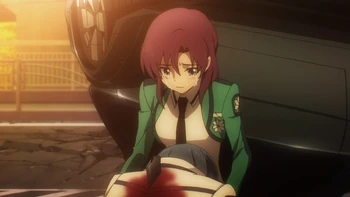 At the second choke point, Takeaki takes out one of the soldiers but there are others hiding behind cover. Suddenly magic ice rains from the sky, neutralising the enemy soldiers. The coast clear, Kanon, Sayaka, Kei, Takaki and Mari leave cover and gather together as Kanon receives a call from Mayumi. With the students distracted, more soldiers run into cover and take aim. Takeaki notices and warns the others as he pushes Sayaka down. The soldiers open fire, and Takeaki defends Sayaka but his leg is blown clean off while Kei is hit by shrapnel while shielding Kanon with his body. The soldiers are about to advance when Miyuki jumps out of the helicopter and kills them all with Cocytus. She then calls out to Tatsuya. Tatsuya flies over and uses Regrowth on Takeaki and Kei at Miyuki’s request, healing them both instantly and leaving everyone shocked. Tatsuya then holds Miyuki close for a moment, telling her she did well, before taking flight once more to re-join the battle.